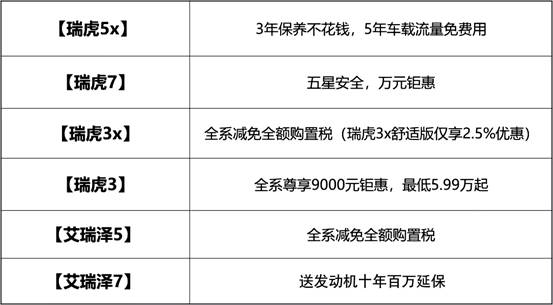 2月1日至2月28日活動(dòng)期間,奇瑞艾瑞澤5、瑞虎5x、瑞虎7等全系車型鉅惠讓利,攜多重豪禮給您拜年!億元豪禮狂歡嗨購(gòu)在即,您還等什么呢?趕快將新春福利帶回家吧!