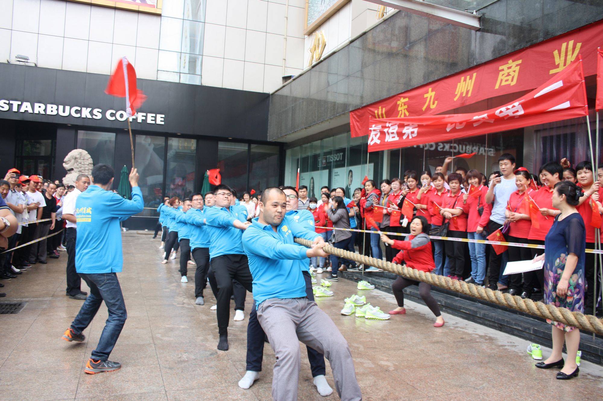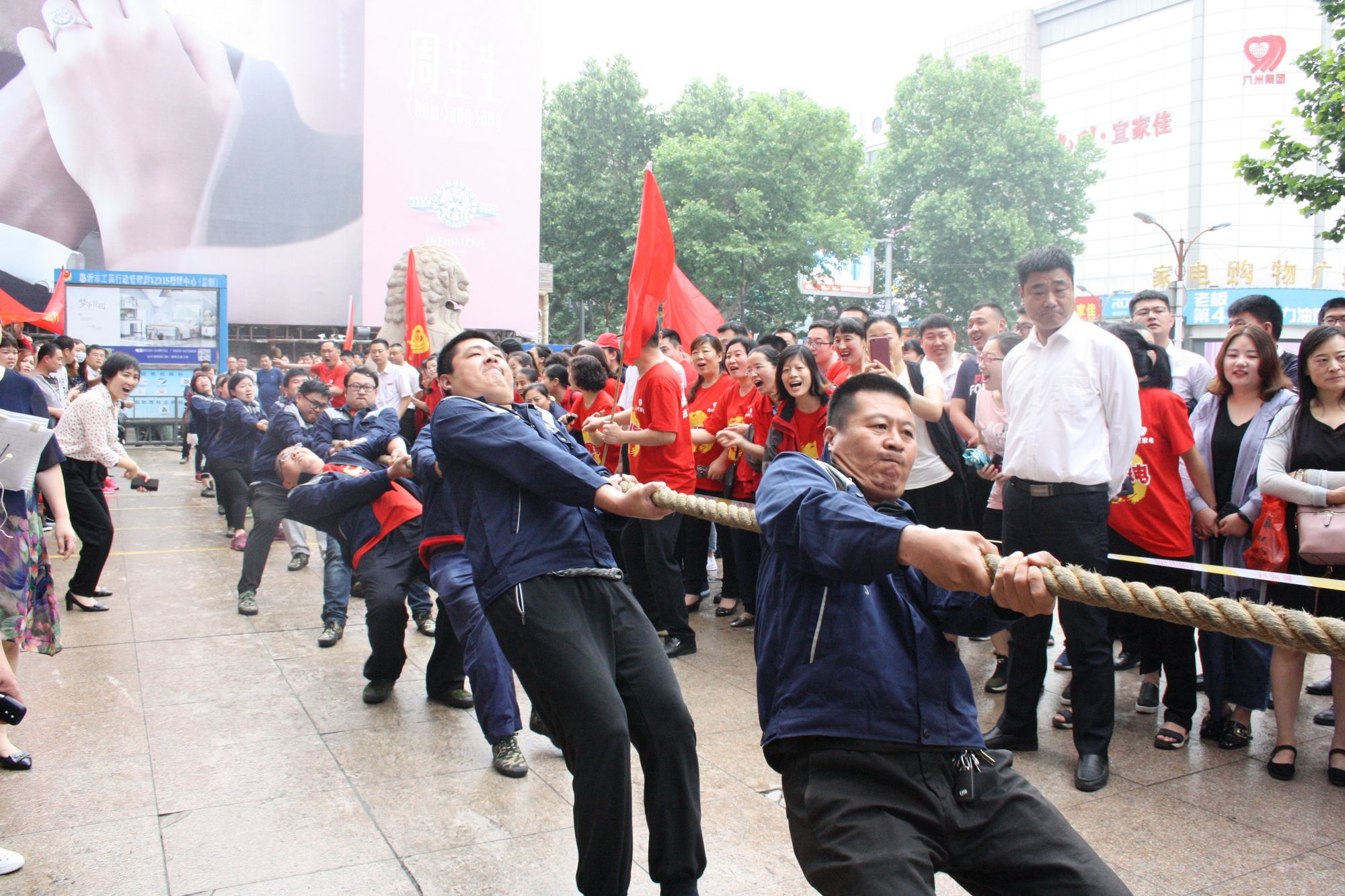 5月17日上午七點,九州集團2018年運動會拔河比賽項目伴著激昂的音樂在九州大廈解放路店廣場拉開帷幕。來自各單位和集團行政的六支代表隊共計 108人參加比賽。 來自各單位和集團行政的六支代表隊,已經(jīng)準(zhǔn)備就緒,蓄勢待發(fā)。一聲哨響,兩隊展開激烈的爭奪,加油聲、鼓勁聲、歡呼聲此起彼伏,你爭我奪,你上我下,一片昂揚氣氛。這是一場勢均力敵的較量,兩隊的比賽已經(jīng)進入膠著狀態(tài),緊張激烈的現(xiàn)場氣氛將整個比賽推向了高潮;這是一場實力懸殊的戰(zhàn)斗,在不甘示弱的團隊爭奪中,永不放棄,勢要賽出團隊的風(fēng)采和精神。經(jīng)過激烈的角逐,來自臨沂賓館的代表隊眾望所歸奪得桂冠,九州大廈代表隊、汽貿(mào)公司代表隊分獲二、三名,九州宜家佳代表隊、超市公司代表隊、集團行政代表隊分獲四至六名。 拔河比賽是九州集團運動會上延續(xù)多年的比賽項目,一年又一年的榮譽爭奪,承載著九州人團結(jié)一心、頑強拼搏的信念堅持;展現(xiàn)著九州人昂揚向上、積極進取的精神風(fēng)貌。(集團辦公室 劉傳芳)
