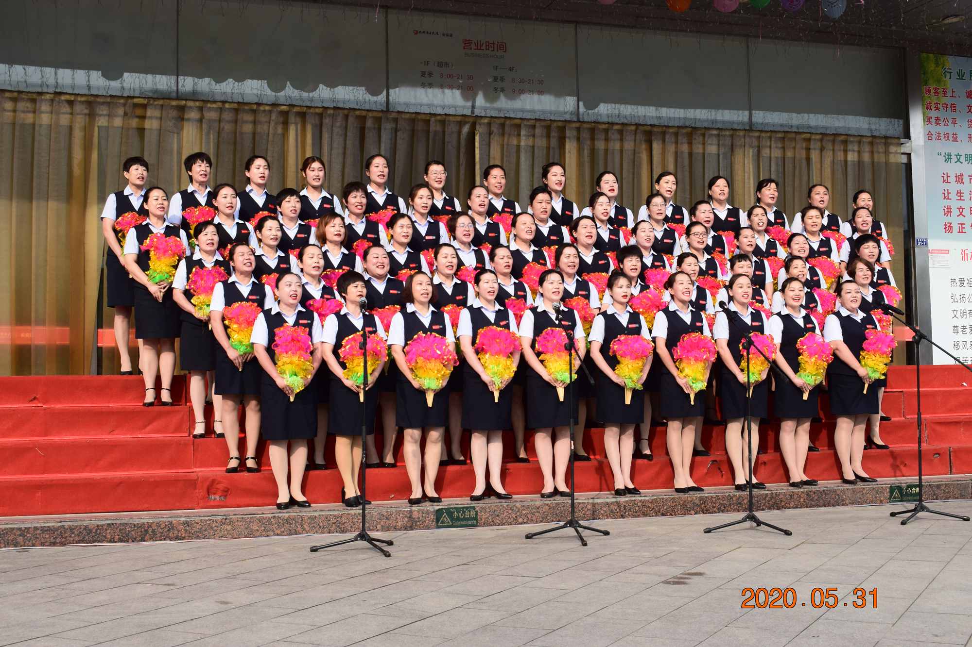 為慶祝九州商業(yè)大廈長(zhǎng)安店開業(yè)6周年,5月31日早上,大廈沂水區(qū)域門店在長(zhǎng)安店門前廣場(chǎng)舉行了盛大的合唱活動(dòng)。