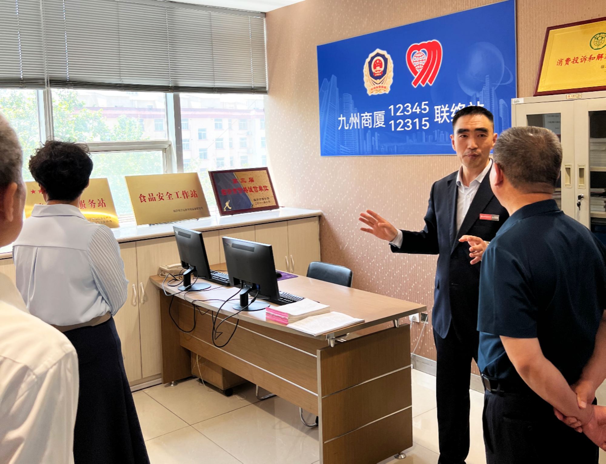 4月25日上午,濟(jì)寧市市場監(jiān)管局一級調(diào)研員、消協(xié)常務(wù)副會長張艷果一行到九州商業(yè)大廈解放路店調(diào)研消費(fèi)維權(quán)服務(wù)站工作開展情況,臨沂市市場監(jiān)管局黨組成員、副局長李曉及分管消保工作的領(lǐng)導(dǎo)陪同。