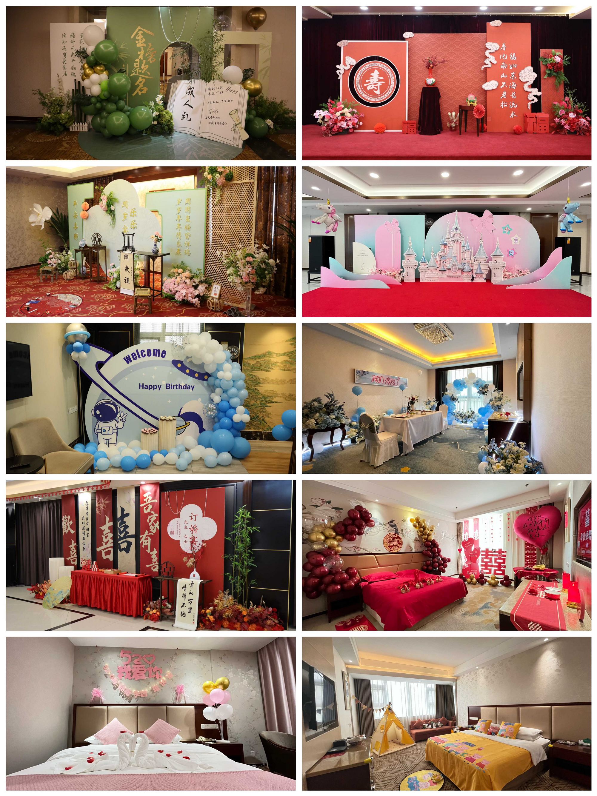 比賽中,各部位根據(jù)房型、宴會(huì)類型等設(shè)計(jì)出了不同場(chǎng)景布置主題。在客房場(chǎng)景上分別設(shè)計(jì)布置了滿足家庭出游需要的“陽光親子房”,浪漫、溫馨、喜慶的“鐘愛一生”發(fā)嫁房,充滿愛意的“傾城之戀”“鐘愛一生”情侶房。在用餐場(chǎng)景上分別以寶寶周歲、兒童生日為切入點(diǎn)設(shè)計(jì)了“掌中寶”和“未來可期”主題包間場(chǎng)景;以寶寶宴、壽宴為思路打造了“夢(mèng)幻城堡”“松鶴延年”主題宴會(huì)廳布置;并制作了適用于升學(xué)、定親場(chǎng)景的“金榜題名”“永結(jié)同心”主題布置。在設(shè)計(jì)上參賽選手巧妙地融合了國潮風(fēng)、卡通風(fēng)等不同元素,呈現(xiàn)出一個(gè)個(gè)富有創(chuàng)意且充滿個(gè)性化的場(chǎng)景布置,場(chǎng)景布置充分體現(xiàn)實(shí)用性和美觀性。