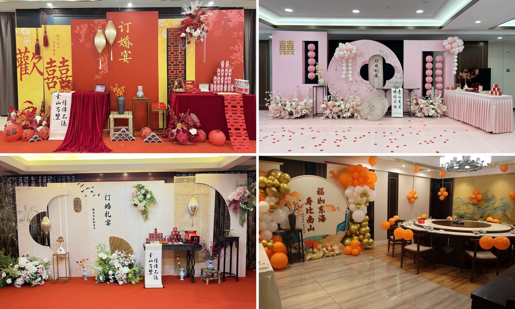 比賽中,各餐廳根據(jù)宴會類型、場地等共設(shè)計出6款主題場景布置。在訂婚宴場景中,有以粉色系為主調(diào),融合珍珠白與玫瑰金,打造浪漫場景的“以愛為名,粉色的約定”場景布置;也有圍繞溫馨、浪漫、國潮創(chuàng)新風(fēng)格的“良辰知音”主題布置;還有中式典雅風(fēng)格的“國風(fēng)雅韻 情定今朝”主題布置,為新人與賓客們打造美好記憶。針對升學(xué)宴,有以藍(lán)色為主調(diào)、融合中式元素與現(xiàn)代祝福的“青衿之志,藍(lán)夢翱翔”主題布置;也有融合《山海經(jīng)》美學(xué)與國潮元素的“鯉躍龍門,國潮少年志”主題布置,寄托對學(xué)子的美好祝福。壽宴場景則以“金色年華,時光禮贊”為主題,以金色與橙色串聯(lián)人生歲月、詠嘆時光。