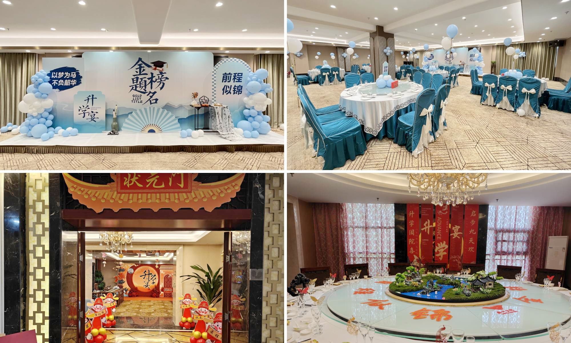 經(jīng)過綜合評分,沂蒙路店貴賓樓布置的“青衿之志,藍(lán)夢翱翔”升學(xué)宴場景獲得宴會廳布置第一名,開發(fā)區(qū)店布置的“鯉躍龍門 國潮少年志”升學(xué)宴場景獲得包間布置第一名。
