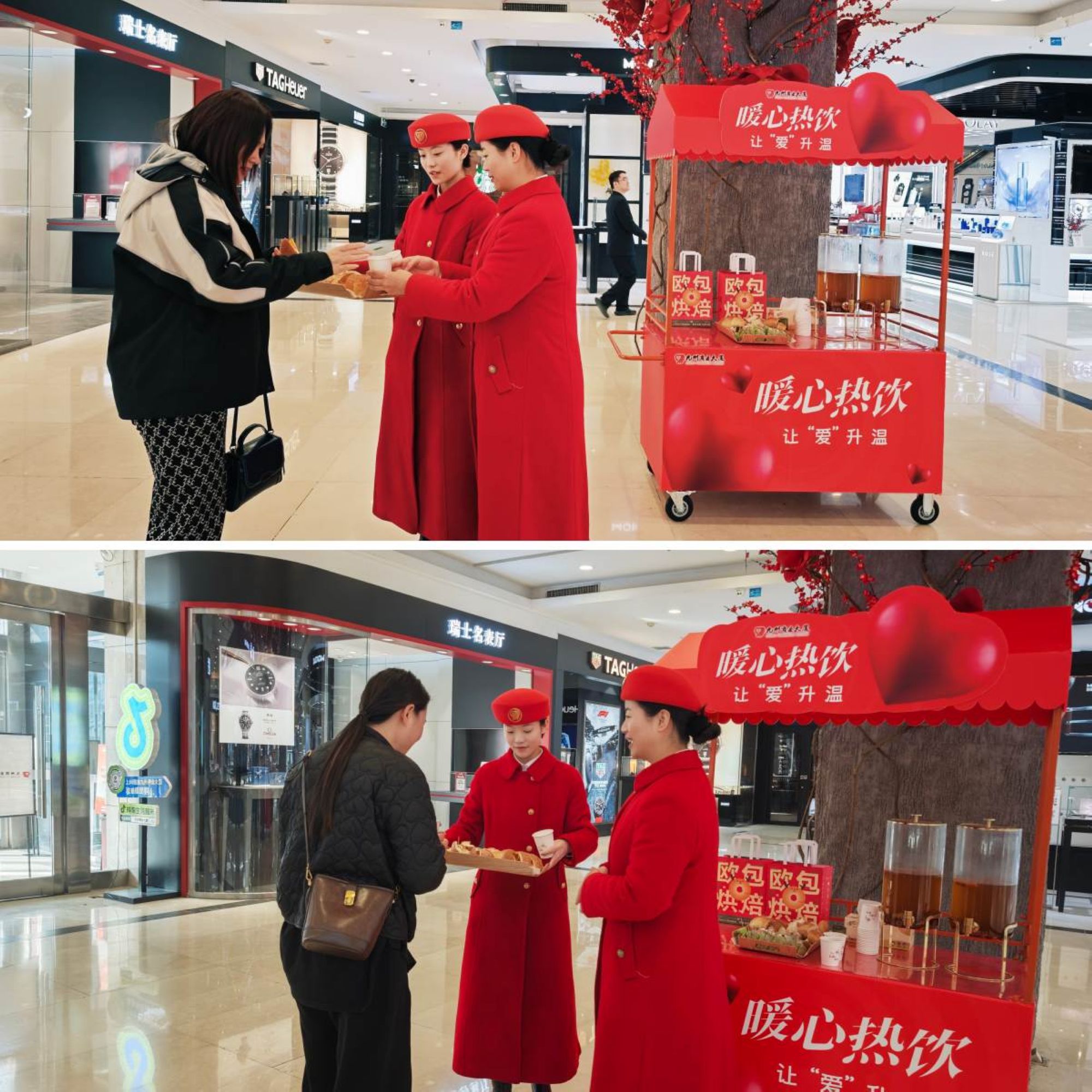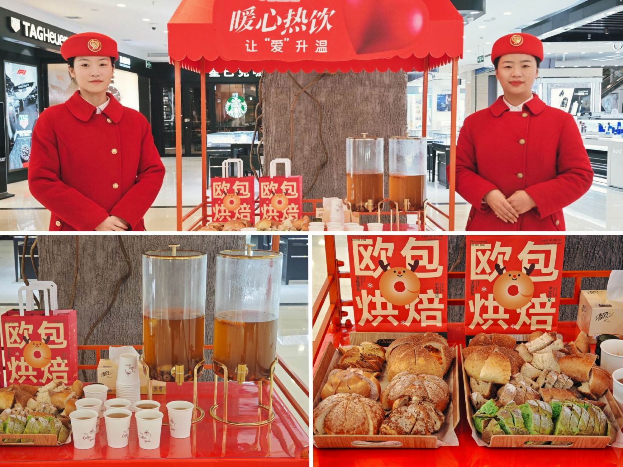 活動(dòng)現(xiàn)場(chǎng)布置了以紅色為主題的暖心熱飲站,備有菊花去火茶、雪梨潤(rùn)喉茶、生姜暖胃茶等熱飲,搭配歐包烘焙小面包供顧客免費(fèi)品嘗。工作人員面帶微笑,為往來顧客遞上一杯杯溫?zé)岬牟栾,讓顧客在?gòu)物之余感受到實(shí)實(shí)在在的關(guān)懷,也讓九州商業(yè)大廈成為冬日里的“溫暖坐標(biāo)”,為顧客驅(qū)走冬日里的嚴(yán)寒冷意。