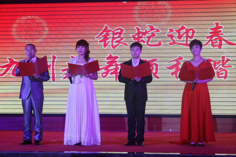 歡歌頌盛世,笑語迎新春。12月27日晚,2013年九州集團元旦文藝晚會在臨沂賓館舉行,楊沂城、王佐文、楊永東等集團領(lǐng)導(dǎo)與干部職工600余人一起觀看演出,共慶元旦佳節(jié)。 晚上6點30分,裝飾一新的臨沂賓館第一會議室成了歡樂的海洋,處處洋溢著喜慶祥和的氣氛。 晚會開始前,集團黨委書記王佐文,代表集團董事會和黨委致賀詞,他向廣大員工、員工家屬及廣大離退休老同志致以節(jié)日的問候,祝大家新年快樂、身體健康、闔家幸福、萬事如意! 晚會在舞蹈《花開盛世中國美》中拉開帷幕。歌伴舞《祝福祖國》、《紅紅的日子》唱出了九州兒女對祖國的無限熱愛。舞蹈《青花瓷》清新的舞姿、《歡聚一堂》熱烈的場面,讓觀眾如癡如醉,贏得了陣陣掌聲。小品《愛在九州》,是我集團員工熱情服務(wù)的真實寫照;而《回家過年》,我們又仿佛從中找到了自己的影子。舞蹈《姑娘我愛你》,一群小伙子用優(yōu)美的舞姿演繹了別樣的柔情;《為九州喝彩》則展現(xiàn)出了九州姑娘們的青春活力。詩朗誦《感恩與成長》、《九州,我用青春的名義為你歌唱》,分別表達了員工對企業(yè)的熱愛,與企業(yè)一起成長的強烈愿望。舞蹈《蒸蒸日上》在最后時刻打出的橫幅“和諧九州 蒸蒸日上”,道出了全體員工共同的心聲。相聲《元芳看九州》,結(jié)合當(dāng)前網(wǎng)絡(luò)流行語,細數(shù)九州一年來取得的輝煌成績;曲藝說唱《喜唱九州春滿園》,形式新穎,用說唱的形式描述企業(yè)五十年走過的不平凡之路。音樂劇《你幸福嗎?》,寓教于樂,道出了幸福的真諦:以創(chuàng)造為樂,以工作為榮;《假如你要認(rèn)識我》、《南泥灣》、《珊瑚頌》《九九艷陽天》……,一首首熟悉的老歌,仿佛讓我們回到了那個激情燃燒的歲月!敦S收的碩果》,用曼妙的舞姿,歌頌勞動,歌頌收獲。影子舞《九州跟黨走》,形式新穎,寓意美好,將整場晚會推向了高潮。 晚會結(jié)束后,集團領(lǐng)導(dǎo)走上前與演職人員合影留念,祝賀演出成功。 整場晚會,節(jié)目形式多樣,豐富多彩,健康向上,從不同的方面歌頌了企業(yè)一年來所取得優(yōu)異成績。