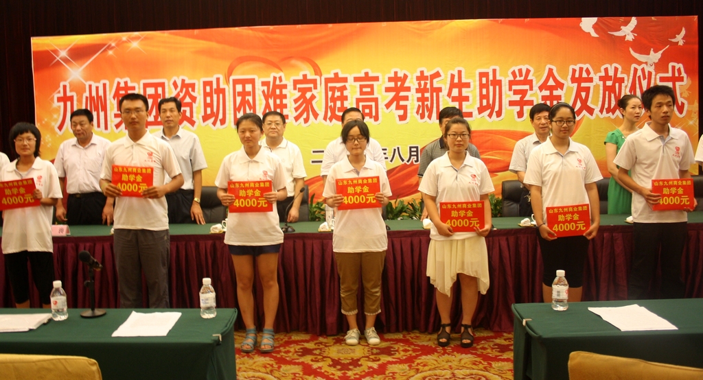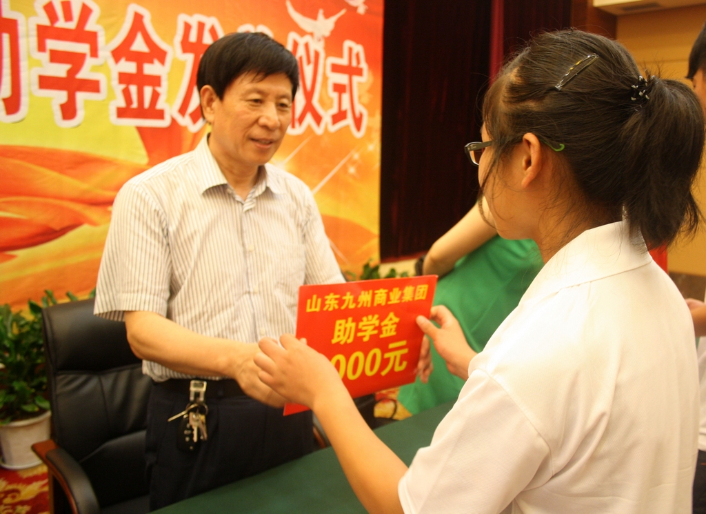 受助學(xué)生 8月15日,九州集團2013年度資助困難家庭高考新生助學(xué)金發(fā)放儀式在臨沂賓館大學(xué)酒店舉行。張聞宇、張佃余等市領(lǐng)導(dǎo),楊沂城、王佐文等集團領(lǐng)導(dǎo)出席九州助學(xué)金發(fā)放儀式,F(xiàn)場100名優(yōu)秀困難高考新生總計獲得40萬助學(xué)金。 市政府黨組成員、市高新技術(shù)開發(fā)區(qū)管委會主任、市慈善總會會長張聞宇在助學(xué)金儀式上講話,對我集團急困難學(xué)生之所急,伸出友愛之手,連續(xù)多年救助困難家庭學(xué)生給予肯定,對我集團積極參與公益事業(yè),支持我市慈善事業(yè)發(fā)展表示感謝。 集團董事長楊沂城在致辭中,代表集團對在今年高考中取得優(yōu)異成績的同學(xué)們表示祝賀。對受助同學(xué)們身處逆境、自強不息、追求夢想的拼搏精神,刻苦學(xué)習(xí)、立志成才、不畏困難的吃苦精神給予了充分肯定,勉勵受助的同學(xué)們珍惜寶貴的學(xué)習(xí)機會,豐富知識、堅定信念、砥礪品格、磨練意志,努力成為社會有用之人、祖國棟梁之材。 受助學(xué)生代表在助學(xué)金發(fā)放儀式上發(fā)言,他們對我集團的大愛之心、大善之舉,表達了由衷的感謝,紛紛表示進入大學(xué)努力學(xué)習(xí),回報社會,永遠不會忘記九州集團的幫助。 九州助學(xué)金截至今年已發(fā)放六屆,六年來發(fā)放助學(xué)金200余萬元,資助優(yōu)秀高考新生600余名。“圓夢沂蒙”已成為我市著名的慈善助學(xué)品牌,榮獲“山東慈善獎最具影響力慈善項目”。 多年來,集團在事業(yè)發(fā)展的同時,始終秉承“敬業(yè)報國 奉獻社會”的經(jīng)營理念,積極投身慈善事業(yè),勇于承擔(dān)社會責(zé)任。近年來,在臨沂市慈善總會的大力支持下,先后組織實施了“情暖萬家”、“朝陽助學(xué)”、“夕陽扶老”、“康復(fù)助醫(yī)”和“愛心助殘”等救助工程,累計為慈善事業(yè)捐款捐物近千萬元,為我市慈善事業(yè)的發(fā)展作出了應(yīng)有貢獻。