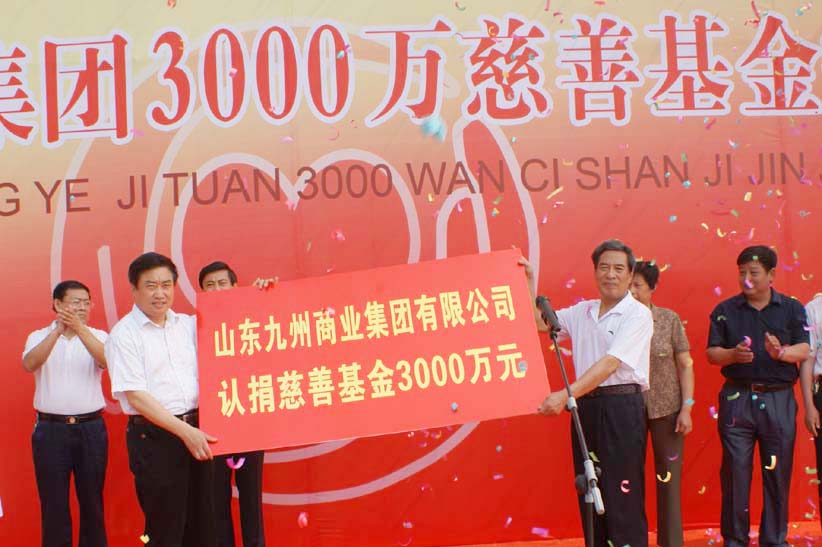 6月5日,臨沂市慈善總會(huì)為集團(tuán)舉行了“山東九州商業(yè)集團(tuán)3000萬(wàn)慈善基金捐贈(zèng)儀式”。臨沂市慈善總會(huì)會(huì)長(zhǎng)、市政府副市長(zhǎng)左沛廷,慈善總會(huì)常務(wù)副會(huì)長(zhǎng)、民政局長(zhǎng)姜新利,慈善總會(huì)副會(huì)長(zhǎng)、集團(tuán)董事長(zhǎng)楊本渠,慈善總會(huì)副會(huì)長(zhǎng)兼秘書長(zhǎng)、民政局副局長(zhǎng)朱步君,以及集團(tuán)領(lǐng)導(dǎo)副董事長(zhǎng)兼黨委書記張素芬、總經(jīng)理?xiàng)钜食恰Ⅻh委副書記王佐文等出席捐贈(zèng)儀式。 此次認(rèn)捐3000萬(wàn)元慈善基金,是集團(tuán)在去年向市慈善總會(huì)認(rèn)捐200萬(wàn)元,設(shè)立“九州慈善基金”的基礎(chǔ)上追加的。隨著追加額度的增加,救助范圍也逐步的擴(kuò)大,從去年的用于助學(xué)擴(kuò)大到走訪困難群眾和其它全市慈善救助項(xiàng)目。多年來(lái),集團(tuán)在自身不斷發(fā)展壯大的同時(shí),牢記報(bào)效國(guó)家、回饋社會(huì)、投身公益的使命,積極參與各類助學(xué)、助殘、救災(zāi)、濟(jì)困等公益活動(dòng)。集團(tuán)累計(jì)捐款捐物達(dá)數(shù)百萬(wàn)元,尤其去年四川大地震后,集團(tuán)全體干部職工心系災(zāi)區(qū),捐款捐物100余萬(wàn)元,受到社會(huì)各界的一致好評(píng)。今年5月9日集團(tuán)被評(píng)為臨沂市首屆“十大慈善單位”。九州人用大愛(ài)譜寫了一曲曲獻(xiàn)身慈善事業(yè)的壯美樂(lè)章。 慈善事業(yè)是一項(xiàng)崇高而光榮的事業(yè),開(kāi)展慈善捐助、幫助弱勢(shì)群體,對(duì)促進(jìn)社會(huì)進(jìn)步,構(gòu)建和諧社會(huì)具有重要而深遠(yuǎn)的意義。隨著企業(yè)的發(fā)展,集團(tuán)將進(jìn)一步投入到慈善事業(yè)中去,為推動(dòng)我市慈善事業(yè)的發(fā)展和構(gòu)建和諧社會(huì)貢獻(xiàn)自己的一份力量。