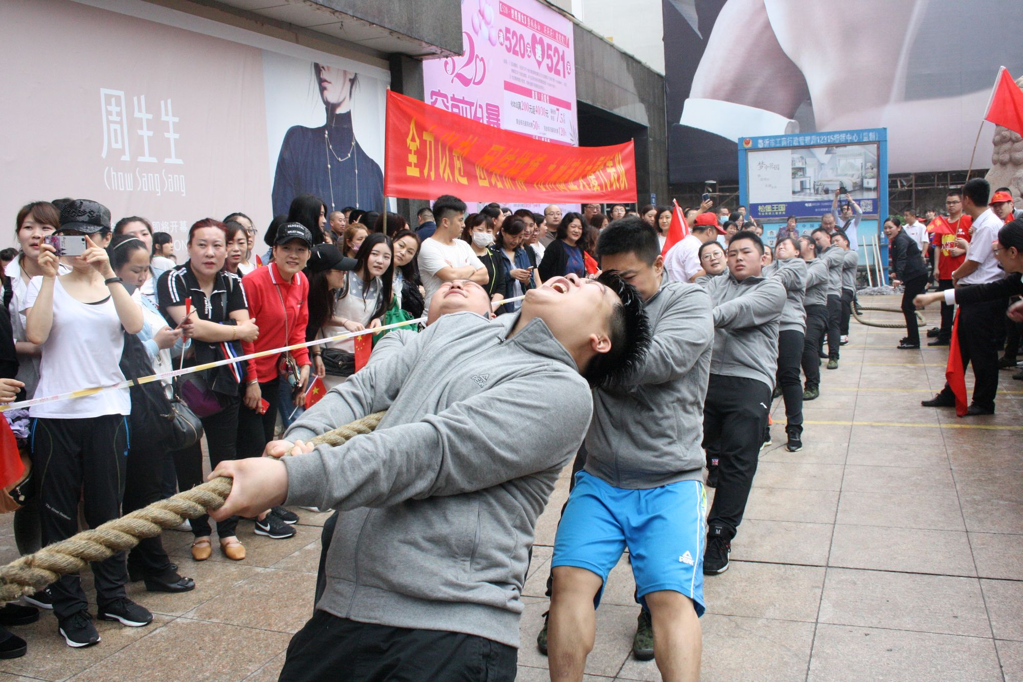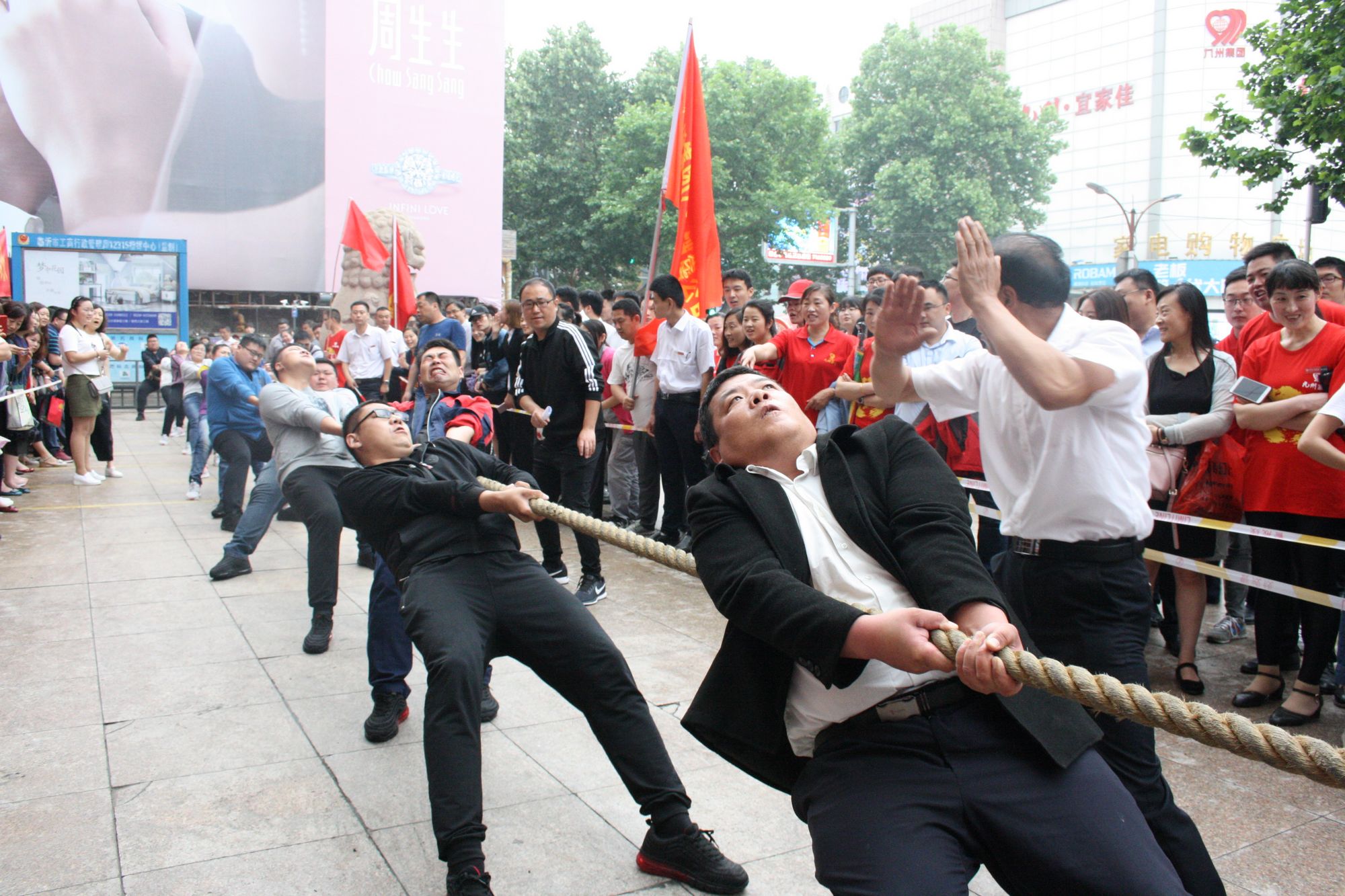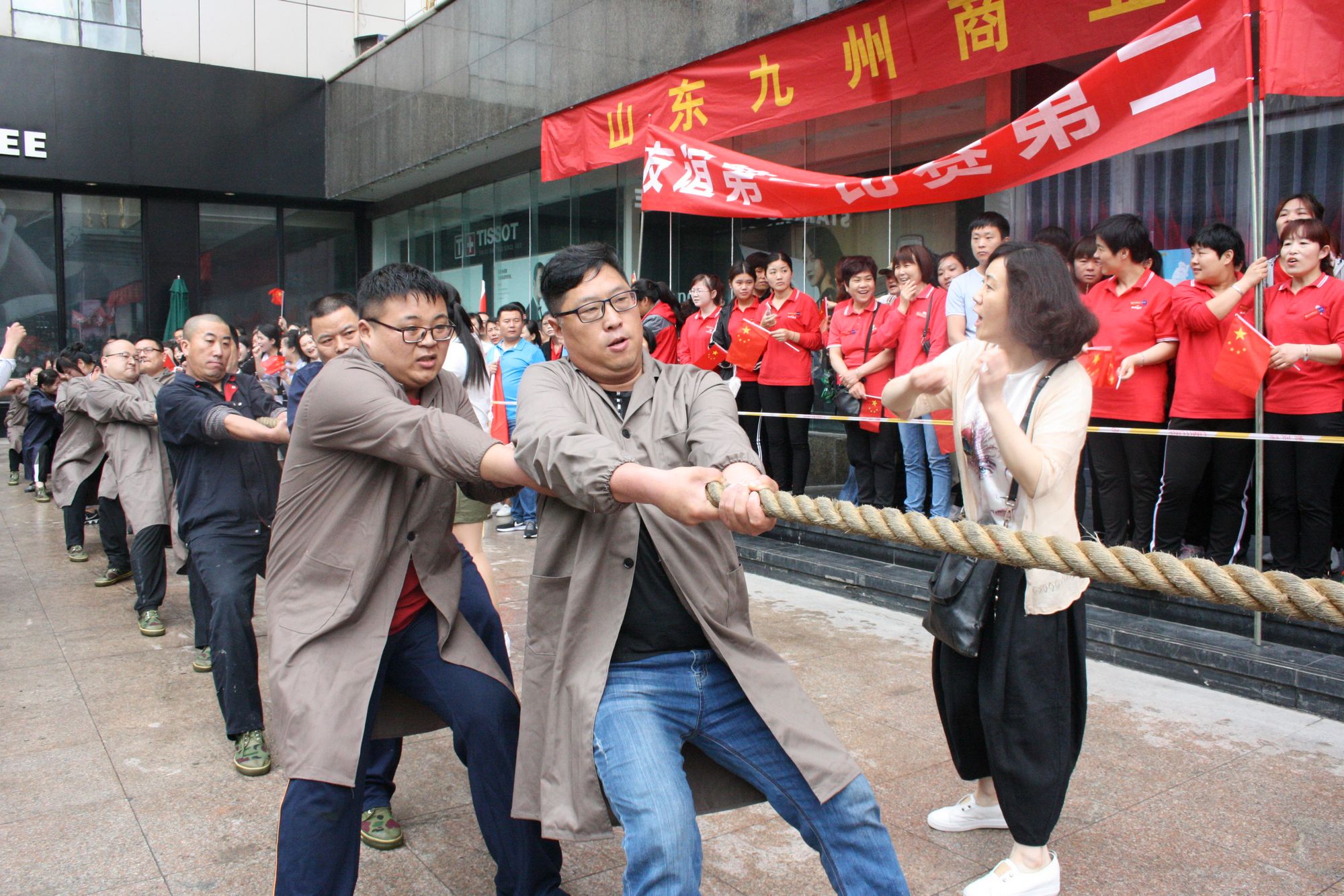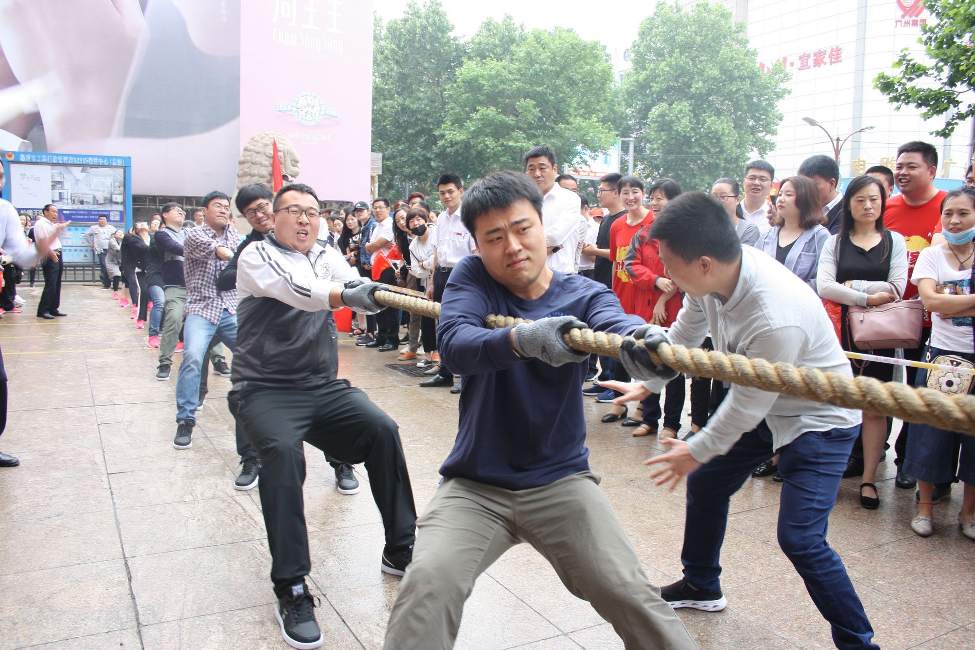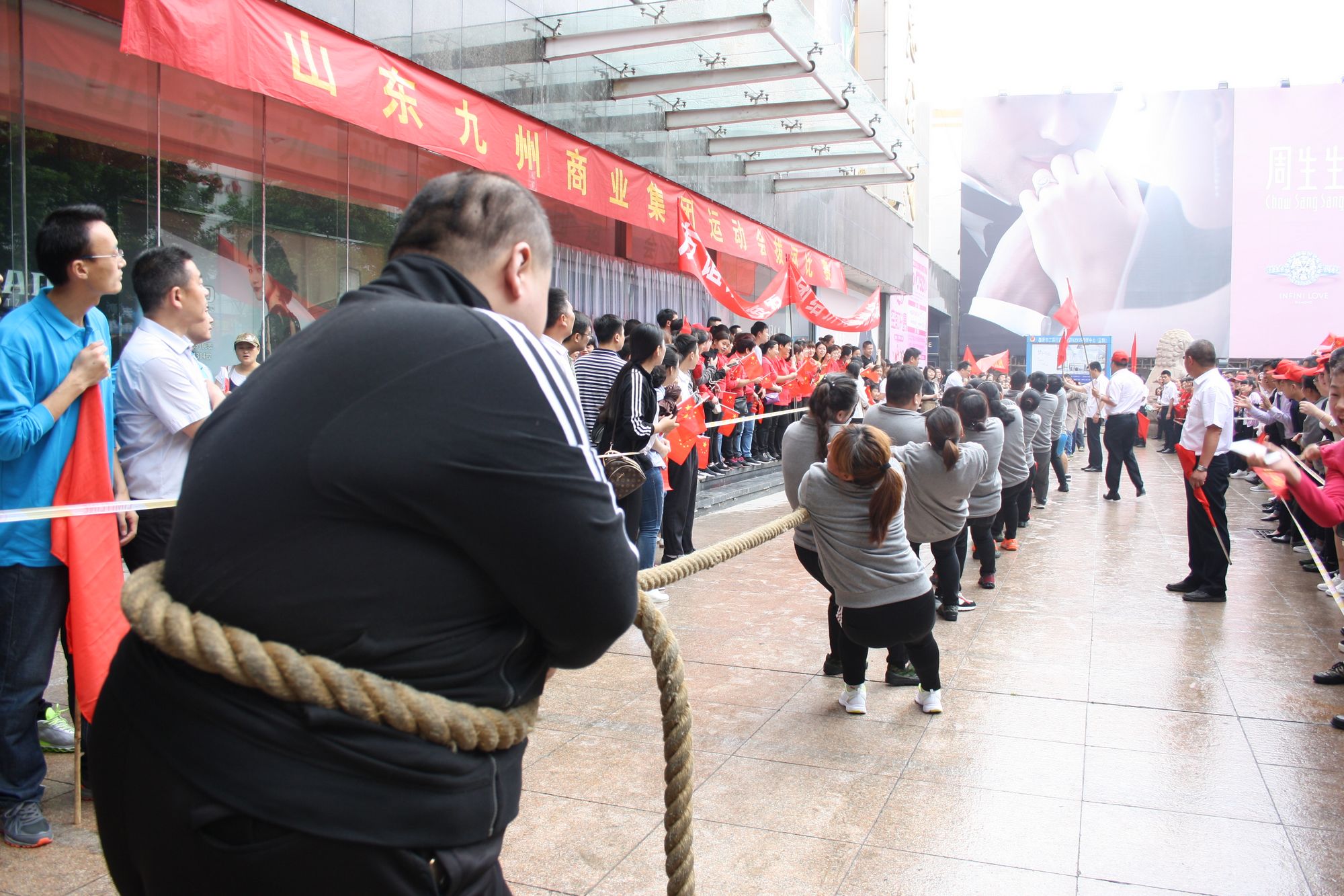 5月17日上午七點,九州集團2018年運動會拔河比賽項目伴著激昂的音樂在九州大廈解放路店廣場拉開帷幕。來自各單位和集團行政的六支代表隊共計 108人參加比賽。 來自各單位和集團行政的六支代表隊,已經(jīng)準(zhǔn)備就緒,蓄勢待發(fā)。一聲哨響,兩隊展開激烈的爭奪,加油聲、鼓勁聲、歡呼聲此起彼伏,你爭我奪,你上我下,一片昂揚氣氛。這是一場勢均力敵的較量,兩隊的比賽已經(jīng)進入膠著狀態(tài),緊張激烈的現(xiàn)場氣氛將整個比賽推向了高潮;這是一場實力懸殊的戰(zhàn)斗,在不甘示弱的團隊爭奪中,永不放棄,勢要賽出團隊的風(fēng)采和精神。經(jīng)過激烈的角逐,來自臨沂賓館的代表隊眾望所歸奪得桂冠,九州大廈代表隊、汽貿(mào)公司代表隊分獲二、三名,九州宜家佳代表隊、超市公司代表隊、集團行政代表隊分獲四至六名。 拔河比賽是九州集團運動會上延續(xù)多年的比賽項目,一年又一年的榮譽爭奪,承載著九州人團結(jié)一心、頑強拼搏的信念堅持;展現(xiàn)著九州人昂揚向上、積極進取的精神風(fēng)貌。(集團辦公室 劉傳芳)