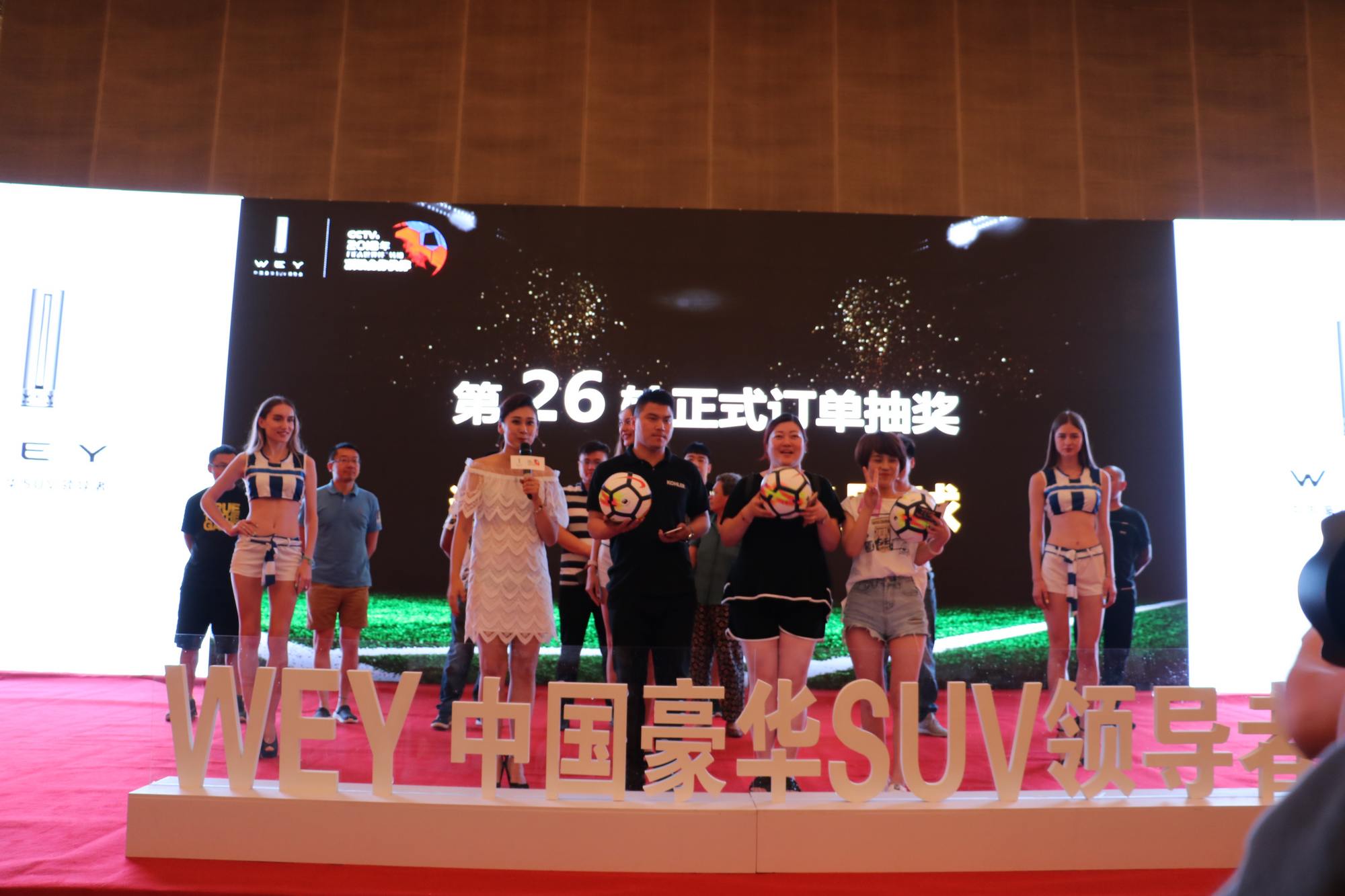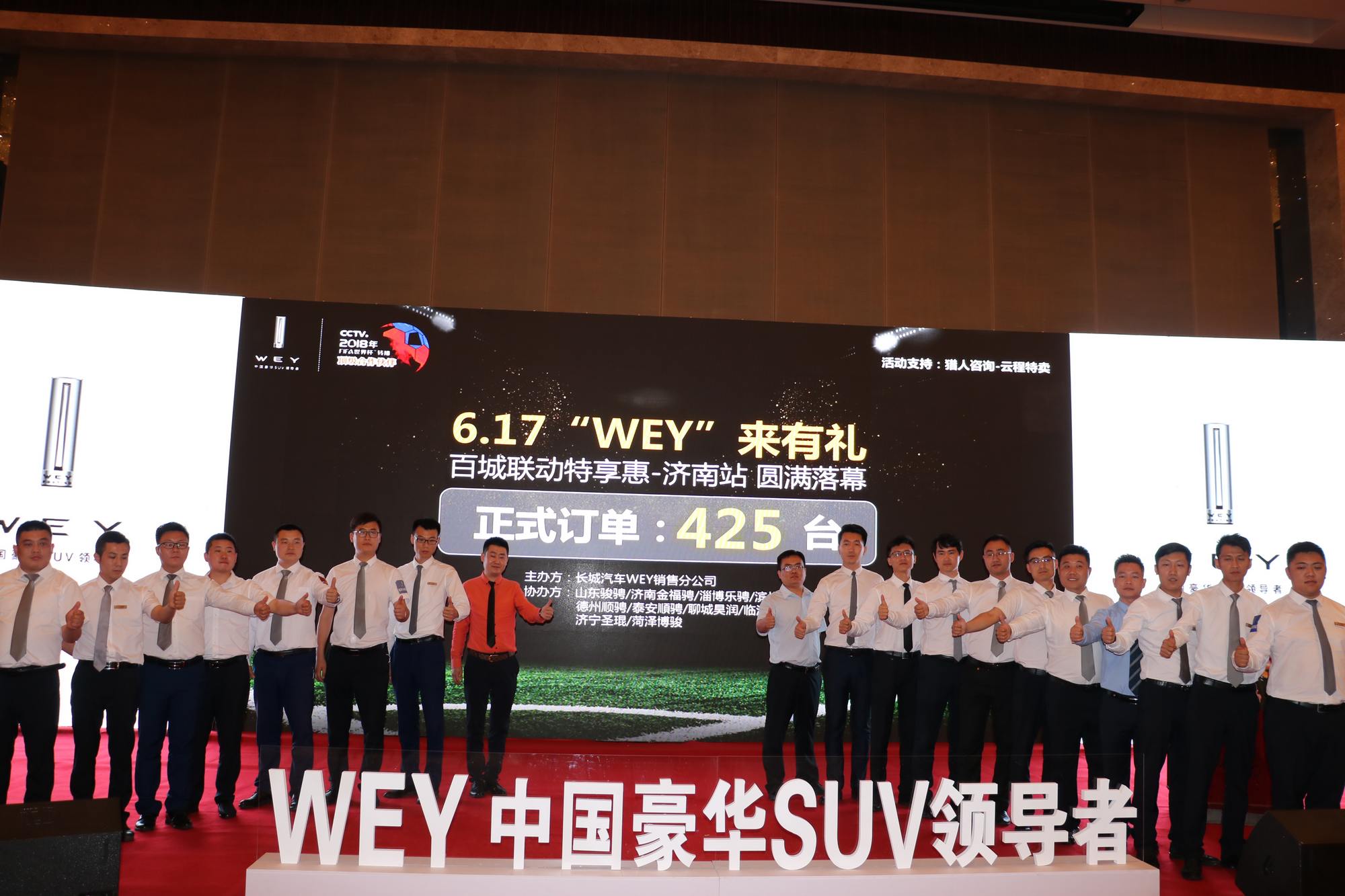 2018年6月17日,由中國豪華SUV領導者WEY品牌主辦的WEY來有禮 | 百城聯(lián)動特享“惠”活動在濟南喜來登酒店隆重舉行。 本次活動廠家共邀請了山東區(qū)域最具影響力的10家經(jīng)銷商參加,各路商家聲勢浩蕩,風塵仆仆,載著尊貴的客戶,帶著滿滿的誠意,從全省各地匯聚省府濟南,共赴這場盛夏之約;顒蝇F(xiàn)場共邀約意向客戶1000余人,精彩節(jié)目輪番上演,政策釋放超出預期,抽獎環(huán)節(jié)吸引眼球,貼心服務無微不至。 活動開始安排了精彩的小提琴和舞蹈演出,讓勞頓的客戶緩解了疲勞。而后,WEY品牌山東大區(qū)總監(jiān)郭紅亮先生發(fā)布官方政策,將此次活動推向了高潮,現(xiàn)場人頭攢動,氣氛熱烈,簽單、刷卡、交現(xiàn)金的客戶排起了長龍;顒尤珗鲈O置了25輪抽獎環(huán)節(jié),小米空氣凈化器、無人機、蘋果筆記本電腦、iphone X等豐厚獎品輪番送出,推出朋友圈點贊活動,集贊數(shù)量前三名的客戶獲得了球星C羅簽名足球?蛻粜χ痤侀_,氣氛嗨爆全場,但秩序井然,因無微不至的服務處處盡顯。我們?yōu)榭蛻籼峁┝素S富的冷餐、飲品、咖啡等茶歇,并在紅毯兩側擺放了品牌文化展架,讓客戶更了解WEY。 本次活動共實現(xiàn)定單425臺,其中九州集團WEY品牌順發(fā)4S店在全員的共同努力下,斬獲55臺定單,圓滿完成了既定目標。