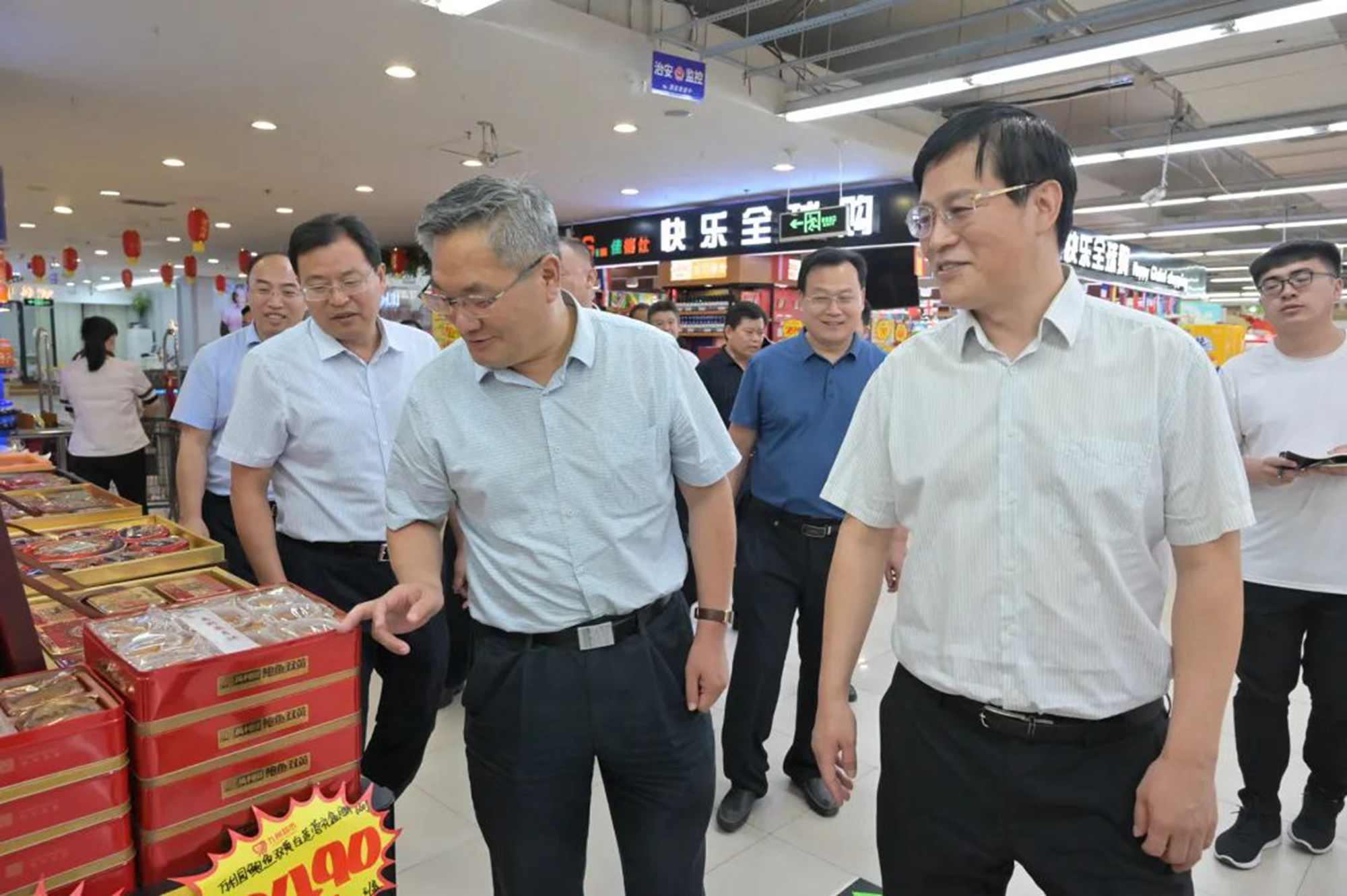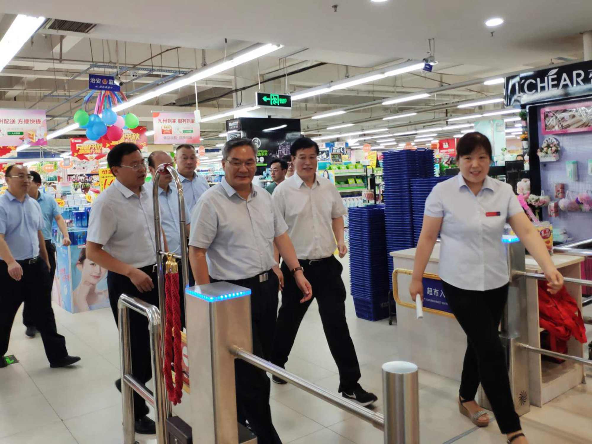 中秋國(guó)慶佳節(jié)來(lái)臨之際,9月25日上午,市政府副市長(zhǎng)劉賢軍帶隊(duì)到九州購(gòu)物中心河?xùn)|店等地檢查食品安全工作。市市場(chǎng)監(jiān)管局黨組書記、局長(zhǎng)黃杰,河?xùn)|區(qū)委副書記、區(qū)長(zhǎng)姚運(yùn)明,集團(tuán)董事長(zhǎng)、總經(jīng)理?xiàng)钣罇|,超市公司總經(jīng)理李國(guó)等陪同。