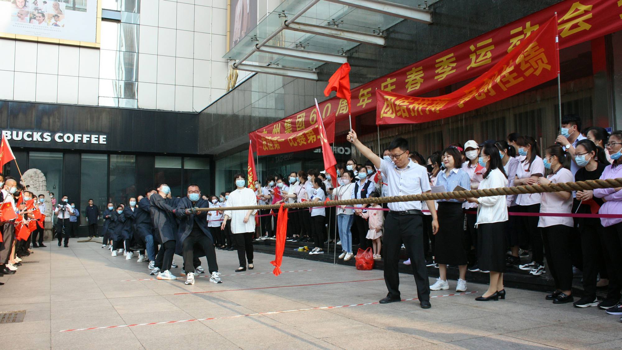 5月25日早上,九州集團(tuán)60周年慶春季運(yùn)動(dòng)會(huì)拔河比賽在九州商業(yè)大廈解放路店門前廣場(chǎng)舉行,來(lái)自各單位和集團(tuán)行政的六支代表隊(duì)參加。本次比賽由集團(tuán)工會(huì)主辦,實(shí)行淘汰制晉級(jí)方式,抽簽分組決定比賽順序。