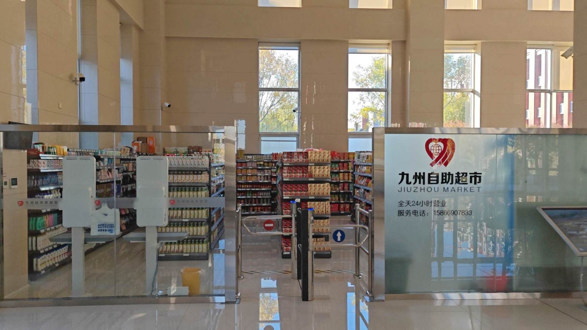 便利店位于臨沂市市委黨校學(xué)員服務(wù)中心大廳內(nèi),經(jīng)營面積60余平方米,為黨校師生提供包含日化百貨、休閑日配、飲料調(diào)味、水果及特產(chǎn)等在內(nèi)的約1200個(gè)單品。顧客通過自動感應(yīng)門進(jìn)入超市,選購商品后,在自助收銀機(jī)掃碼付款即完成購物,全程無人售貨。便利店實(shí)行全天24小時(shí)營業(yè)模式,顧客可以方便高效的進(jìn)行自助購物。