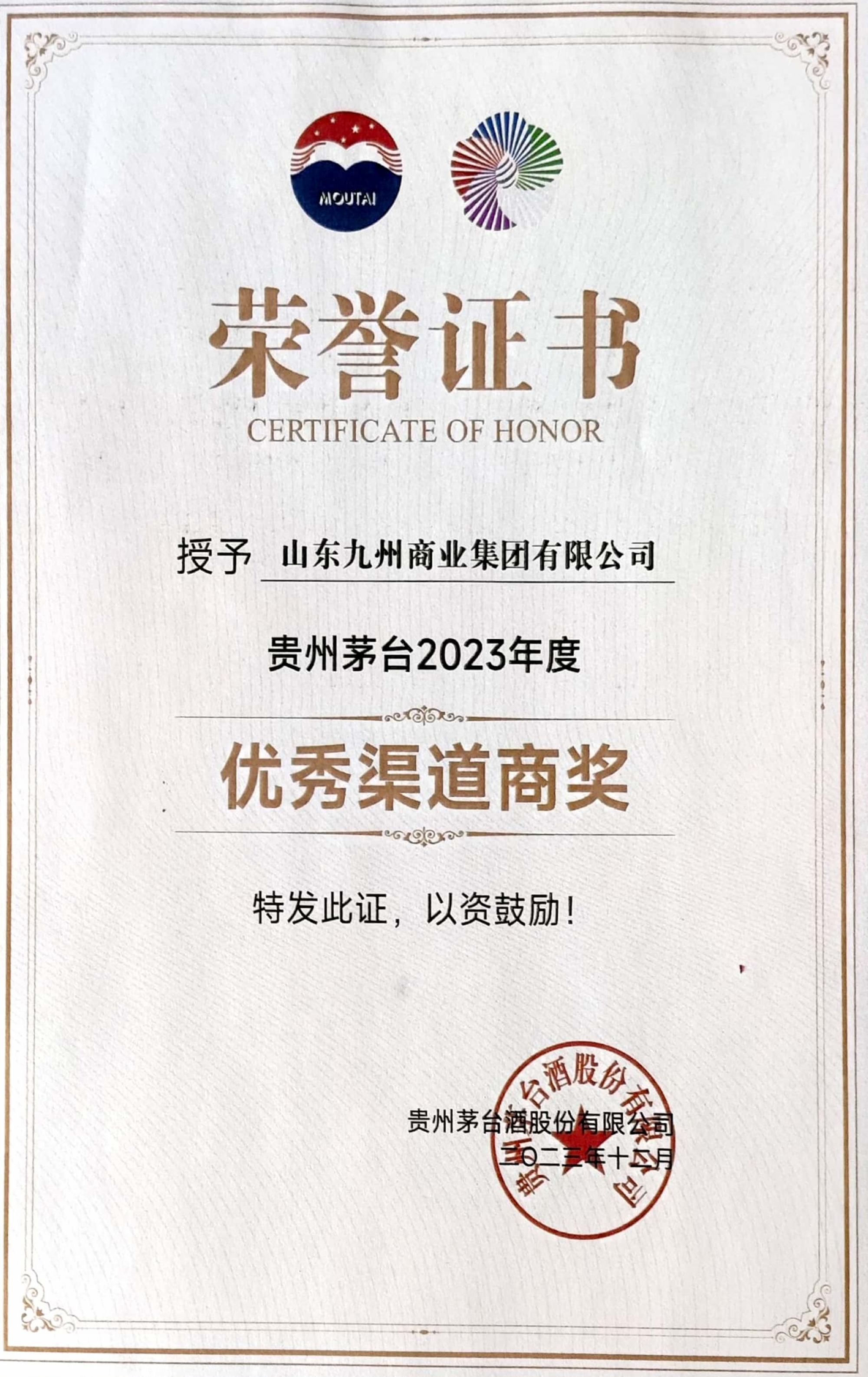 2023年12月31日,貴州茅臺(tái)酒市場(chǎng)工作會(huì)在三亞召開(kāi)。會(huì)上對(duì)在2023年茅臺(tái)營(yíng)銷(xiāo)工作中表現(xiàn)優(yōu)秀的單位及個(gè)人進(jìn)行了表彰。山東九州商業(yè)集團(tuán)有限公司榮獲“貴州茅臺(tái)2023年度優(yōu)秀渠道商獎(jiǎng)”。