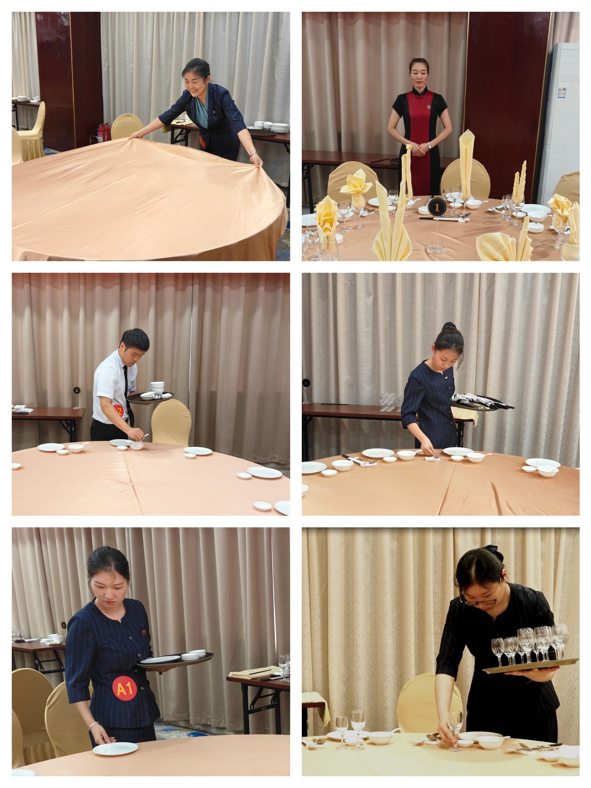 本次技能比武項目為餐廳中餐宴會擺臺,比賽分為員工組和基層管理人員組,現(xiàn)場抽簽決定參賽順序。賽場上,選手們全神貫注,在規(guī)定的時間內,憑借自己的專業(yè)技能,將一張張普通的餐桌布置成既美觀又實用的用餐環(huán)境。鋪桌布時行云流水,定位餐具時快速均,餐巾折花綻放栩栩如生的造型,每一個細節(jié)都彰顯著選手們扎實的功底與精益求精的技藝。經(jīng)過評委綜合評比,開發(fā)區(qū)店餐廳部薛會娜和陳彩霞分獲基層管理人員組和員工組第一名;宗龍星、丁朝陽分獲基層管理人員組第二、第三名,付振云、房桂宇分獲員工組第二、第三名。
