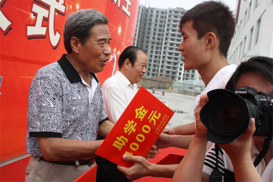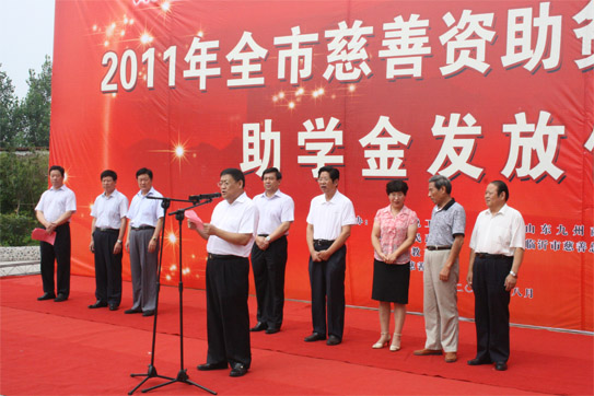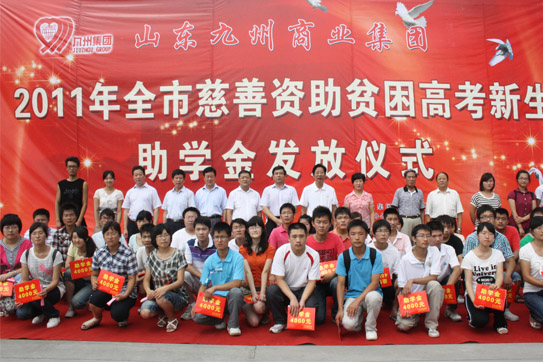 | 8月12日,2011年度山東九州商業(yè)集團資助貧困高考新生助學金發(fā)放儀式在臨沂賓館大學酒店舉行。50名在今年高考中取得優(yōu)異成績的貧困新生每人領到了4000元九州慈善助學金。市委常委、市總工會主席林祥余、市政協(xié)副主席趙愛華、市人大常委會法工委主任殷洪舉、市民政局局長姜新利、市紀委派駐五組副書記王培成、市慈善總會副會長楊本渠、集團董事長楊沂城、集團黨委書記王佐文等出席儀式。 市慈善總會副會長楊本渠為貧困大學生發(fā)放助學金