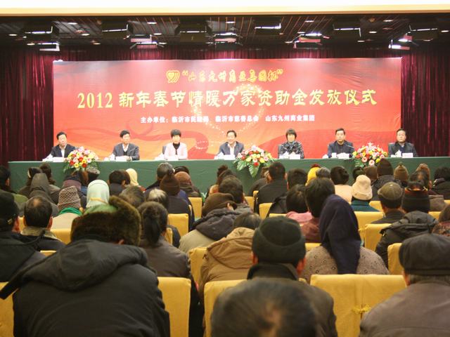 1月14日,春節(jié)來臨之際,由集團(tuán)公司與臨沂市民政局、臨沂市慈善總會(huì)聯(lián)合主辦的“九州集團(tuán)杯” 2012年新年春節(jié)慈善資助金發(fā)放儀式在臨沂賓館大學(xué)酒店舉行。市委常委尹長友、市人大常委會(huì)副主任馮安、市政協(xié)副主席趙愛華、市民政局局長姜新利、市慈善辦主任李長征,集團(tuán)領(lǐng)導(dǎo)王佐文、楊永東出席資助金發(fā)放儀式。 活動(dòng)現(xiàn)場,市領(lǐng)導(dǎo)與集團(tuán)領(lǐng)導(dǎo)為來自全市的400個(gè)困難家庭,發(fā)放了40萬救助金。
